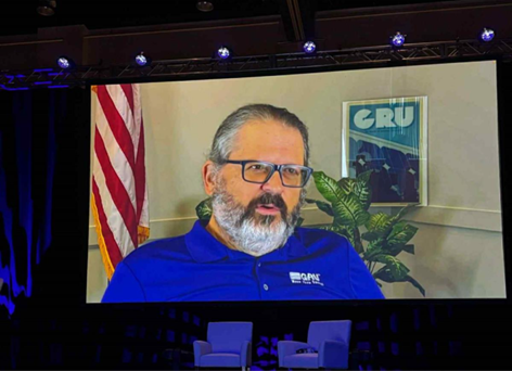 Next, we heard from two leaders at Gainesville Regional Utilities (GRU), the fourth largest municipal utility in Florida. First, Chad Parker, energy delivery officer at GRU shared lessons learned from the GRU’s transition to advanced metering infrastructure (AMI), including the importance of the “three Ps”–partnership, people and persistence—when navigating the challenges of deploying new technology. Then we heard a pre-recorded video message from GRU CEO Ed Bielarski about the utility’s history and journey of transformation.