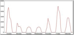 The following figure shows the hourly light intensity for a one week period. The pattern is clear: light intensity increases in the morning hours; it typically reaches a peak during the middle of the day; and it declines in the afternoon. And, the height of the curve varies from day-to-day, partly as a function of cloud-cover.