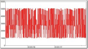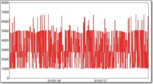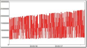 Although I did not have data on solar capacity, my assumption for this area is that BTM capacity is increasing over time. To account for the increasing BTM capacity, I created an interaction variable, which multiplies the light-intensity variables by a linear time-trend variable. The result is a series that moves up and down from day-to-day, as the intensity of the light changes, but which also increases over time, as shown below.