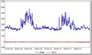 The following is the BX tab from a MetrixND regression model. The figure shows the contribution of the trended solar variable (in red) and the model’s predicted value (in blue). As expected, the contribution to the total predicted value is negative and becomes larger in absolute terms (i.e., more negative), thus reducing the load by larger quantities over time.