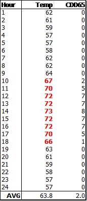 Traditionally, CDD and HDD concepts are constructed by first calculating daily average temperature— either averaging the 24-hourly observations or taking the average of the daily maximum and minimum— and then calculating CDDs and HDDs for the desired breakpoints. This is, by definition, aggregation bias, averaging before calculating the nonlinear values. This got me thinking, should we be calculating CDD and HDD concepts on the hourly values first and then averaging for the day? If you do not have historical hourly weather, the point is moot. But let’s assume you do. The table below contains 24 hourly temperature observations. The average temperature for the day is 63.8 degrees, calculating a CDD in base 65 would result in zero CDDs, but if you first calculated the CDDs and then averaged, you would end up with two CDDs. Was there cooling during the day or not? Thinking from a residential customer’s perspective, a few warm hours in the middle of the day wouldn’t necessitate turning on the air conditioner. During the height of summer or winter, it will not matter—when all hourly observations are above or below the breakpoint, the two methods will return the exact same value.
