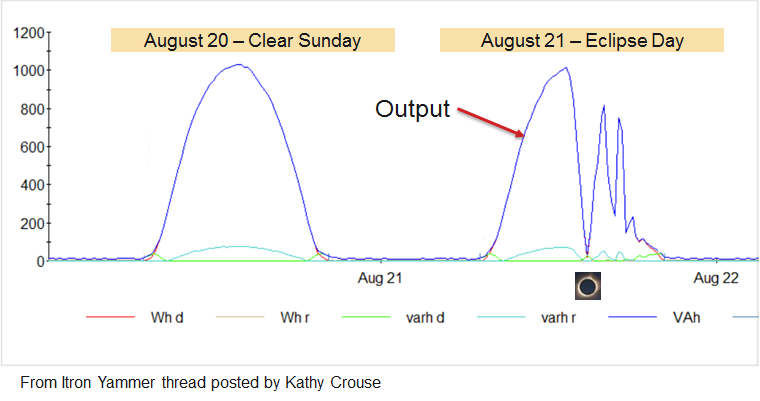 More interesting than the allure of the moon blotting out the sun was later seeing how it affected utility loads. Below is a chart of high frequency data illustrating the impact of the eclipse on the solar panel that is in front of the Itron factory in Oconee. This illustrates how the eclipse lowered solar output (almost to zero) in totality areas. Following the eclipse, afternoon clouds had a similar but less complete impact.