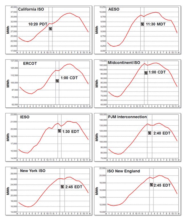Using publicly available data provided by the North American ISOs/RTOs/TSOs, we can see that loads in fact declined as the path of totality traversed across the continent. Below is a series of charts displaying the hourly loads for each of the ISOs/RTOs/TSOs on Aug. 21 with the time highlighted at which the eclipse reached its fullest in each area.