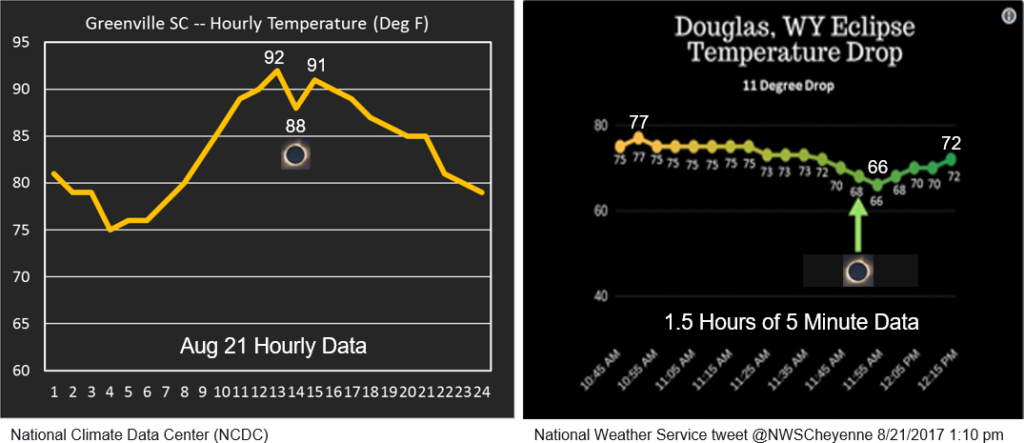 In looking at the data, we see that the loads moderately drop during the eclipse hours. This is attributed to the drop in temperature, which accompanies an eclipse, an outcome that many eclipse viewers observed. Apparently, the temperature drop and the corresponding decline in air conditioning loads outweighed the loss of solar output. Obviously, location played a big role, as some places experienced a steeper drop in temperature than others. Below are two charts demonstrating the decline in temperatures as recorded in Greenville, South Carolina and Douglas, Wyoming, respectively.