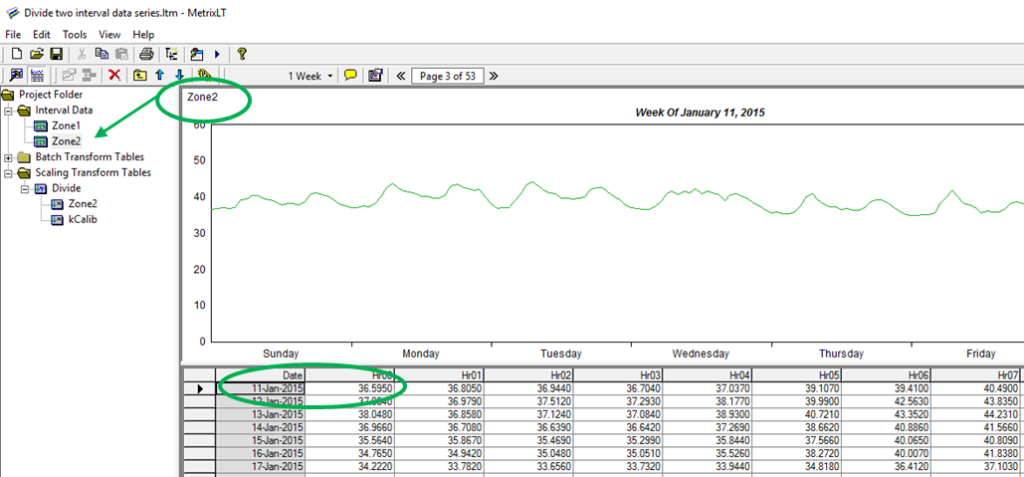 Create a Scaling Transformation and configure the Forecast Variable and the Input Series boxes. In the Forecast Variable box, insert the hourly data used as the numerator. In the Input Series box insert the hourly data used as the denominator. In the example, Zone1 is the numerator and Zone 2 is the denominator.