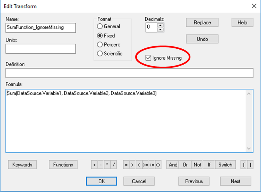 While the sum function behaves the same, the “Ignore Missing” option changes the behavior to produce a value.  In other words, the sum function with the Ignore Missing option means a number plus a missing value equals a number.