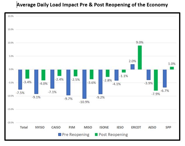 - Phased Reopening of the Economy: the period of May 18 through June 14 marks the start of the phased re-opening of the of the economy. Over this period, the reduction in average loads is estimated to be -3.4%, which represents a gain in average daily power consumption of about 4.0%.