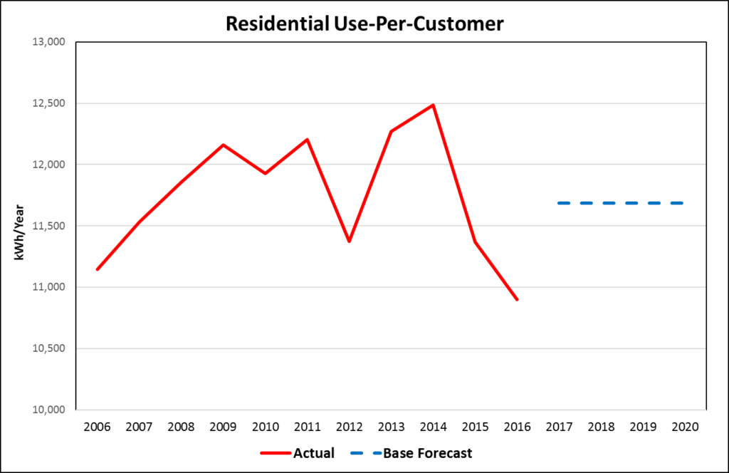 Below is annual historical average use for residential customers over an 11-year period. Leaving the forecast to a regression model with HDD, CDD, and some binary variables, the outlook is close to 11,600 kWh/year (blue dashed line) and flat because the model does not include any trend variables.