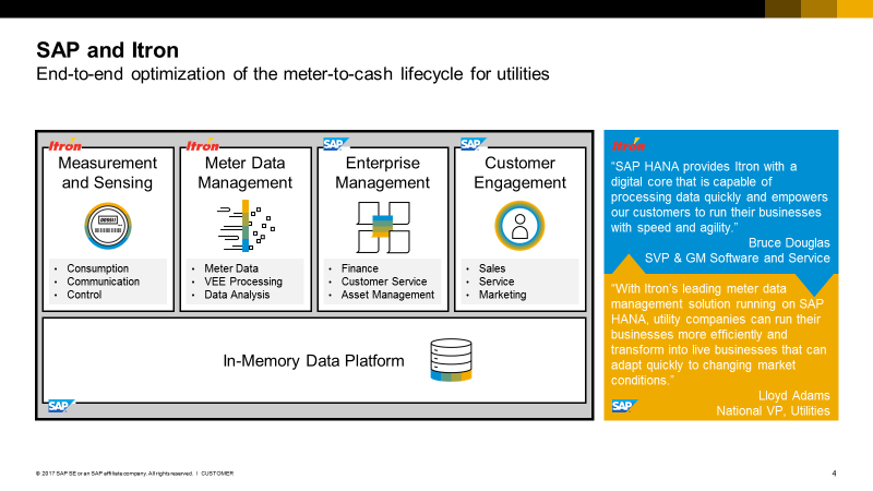 Both SAP and Itron are committed to increasing the efficiency of our customers. We believe that evolving software solutions are higher-value assets that will enable utilities to become more efficient. Together, SAP and Itron can offer a solution to meet existing analytic requirements and a platform for future initiatives. IEE MDM and SAP HANA will enable utilities to initiate their digital transformation journey, thereby eliminating data silos, driving cost and complexity out of the meter-to-cash scenarios, improving operational efficiency and providing real-time advanced analytical capabilities—all on a single platform.