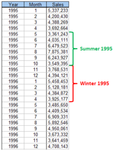 Let’s be more specific. The picture to the right shows the monthly sales. Ray wants to call November 1995 through April 1996 the Winter 1995 sales.