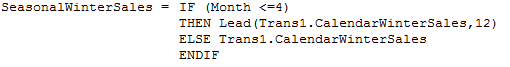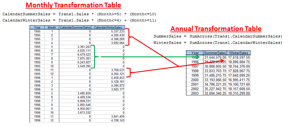 Typically, the MetrixND’s SumAcross function is used to convert monthly data to annual total. The process takes two steps. First, the monthly sales are split into calendar summer and winter sales in a monthly transformation table. Second, the annual sums are calculated using the SumAcross function in an annual transformation table. The steps, transformations, and results are show below.