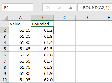 Essentially, values with an even significant digit (e.g., 61.45) are rounded down, while those with odd significant digits (e.g., 61.55) are rounded up. Other decimal fractions round as you would expect. Only significant digits followed by a 5 get this “special” treatment.