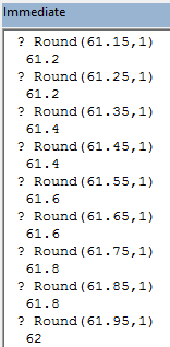 Developed by the Institute of Electrical and Electronics Engineers (IEEE), this algorithm is designed to minimize rounding bias that results from consistently rounding a midpoint value in a single direction. The way it works is, numbers, which are equidistant from the two nearest integers, are rounded to the nearest even integer. This means that a number like 63.5 would get rounded to 64.0, while a number like 62.5 would get rounded to 62.0. Below is an example generated in VBA Editor.