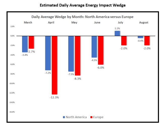 Across Europe and North America, the biggest estimated load reductions occurred in April with an estimated reduction in average daily load between -12.3% and -7.2%. In recent months, the combination of the relaxing of lockdown restrictions and hot weather has led to no apparent load impact in North America, but a continued small impact in Europe.