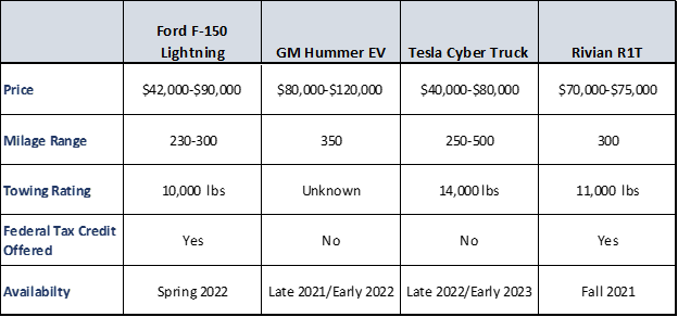 Ford is not the only player in the electric truck market, Rivian, Tesla and GM all have EV trucks that will be available by 2022. The Ford has the lowest starting price for an all-wheel drive model, comparable range, unique features and the federal tax credit still applies, but most importantly, it has name recognition. The table below compares the four EV trucks currently known to be available in 2021/2022. Price and range can be somewhat difficult to compare as there are multiple trims for each truck and multiple battery options, but the table gives a general comparison. Chevrolet and Ram also announced plans to build EV trucks, but I have not included these because the specifics were unknown as of August, and they will likely be 2023/2024 models. The prices do not include the federal tax credit of $7,500, which is no longer available for GM and Tesla vehicles.