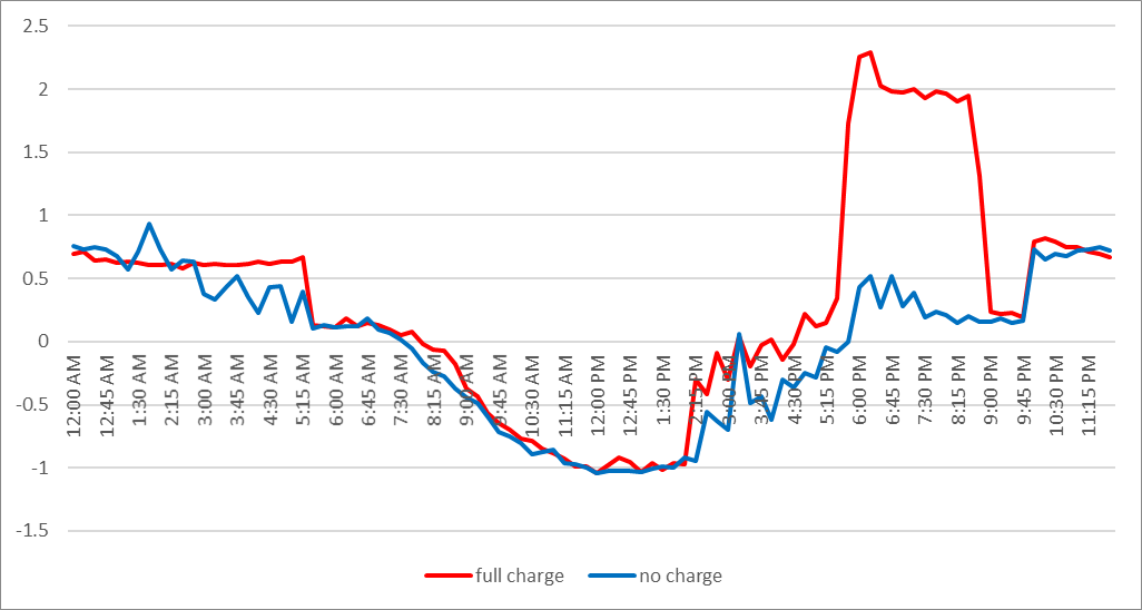 While slow charging my EV was doable, adding a level 2 charger would relieve some unnecessary stress. A full charge could be done in 3 to 4 hours vs 19 hours. It had to be done. I still can’t jet off to Las Vegas with my driving range, but at least I can go downtown on the spur of the moment without having to worry whether I will make there and back. A level 2 charger brought a bigger jump in energy usage, but for a much shorter time. Below is a graph of a day doing a full EV charge vs a day of no charging. The increase from 10 p.m. to 5:30 a.m. is keeping my house at a frozen tundra temperature using the air conditioning.