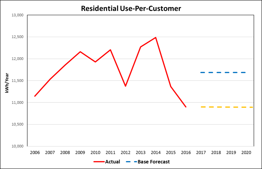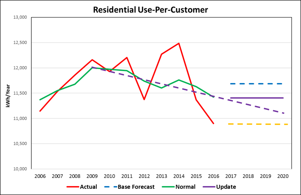Below is annual historical average use for residential customers over an 11-year period. Leaving the forecast to a regression model with HDD, CDD, and some binary variables, the outlook is close to 11,600 kWh/year (blue dashed line) and flat because the model does not include any trend variables.
